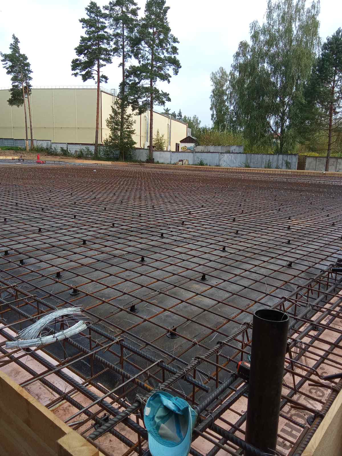 - Перед заливкой бетона проводится армирование — укладка металлической сетки, которая придаст плите дополнительную прочность.