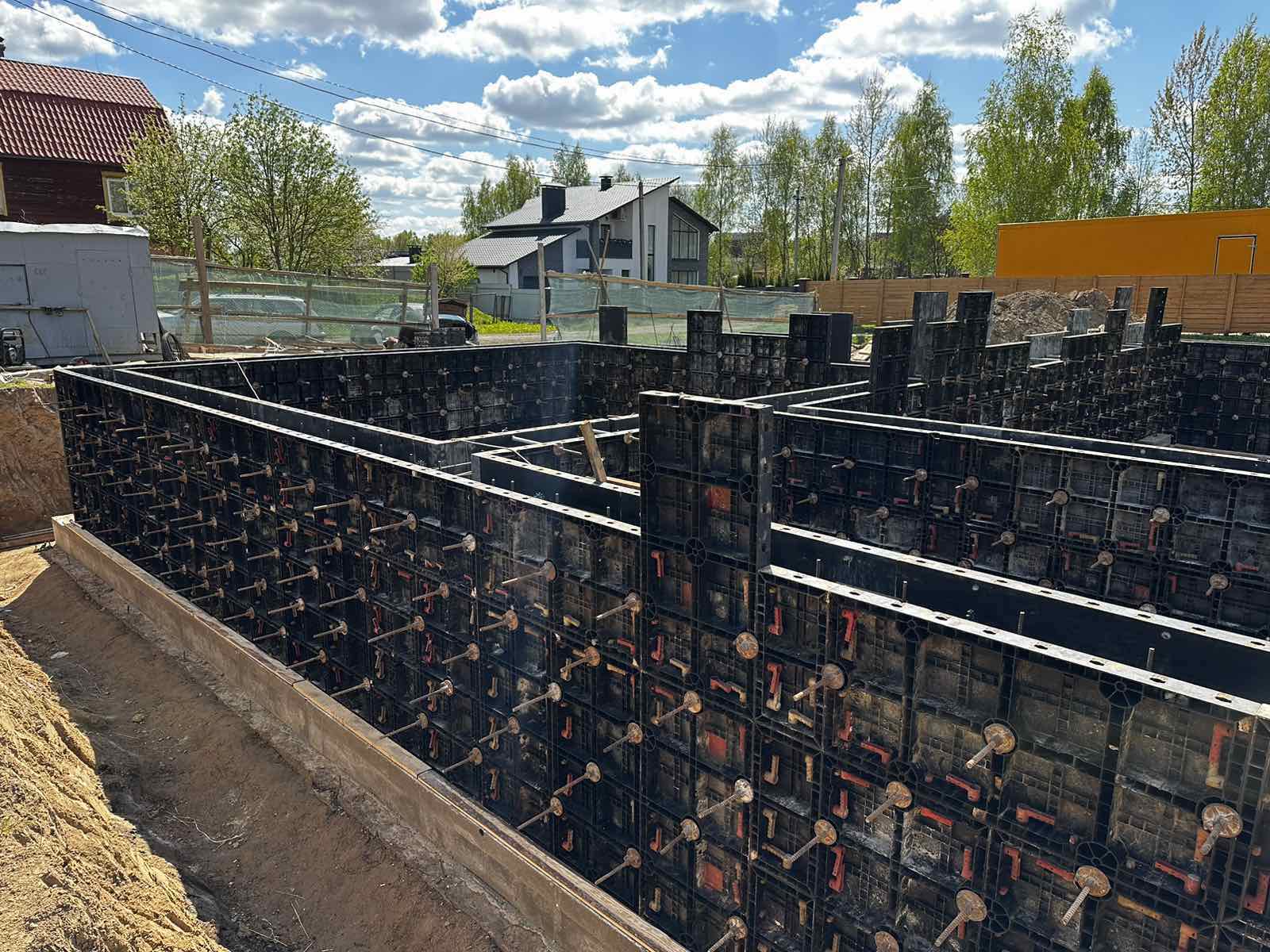 - Опалубка устанавливается для создания формы будущих стен. Это важный этап, от которого зависит точность и качество конструкции.