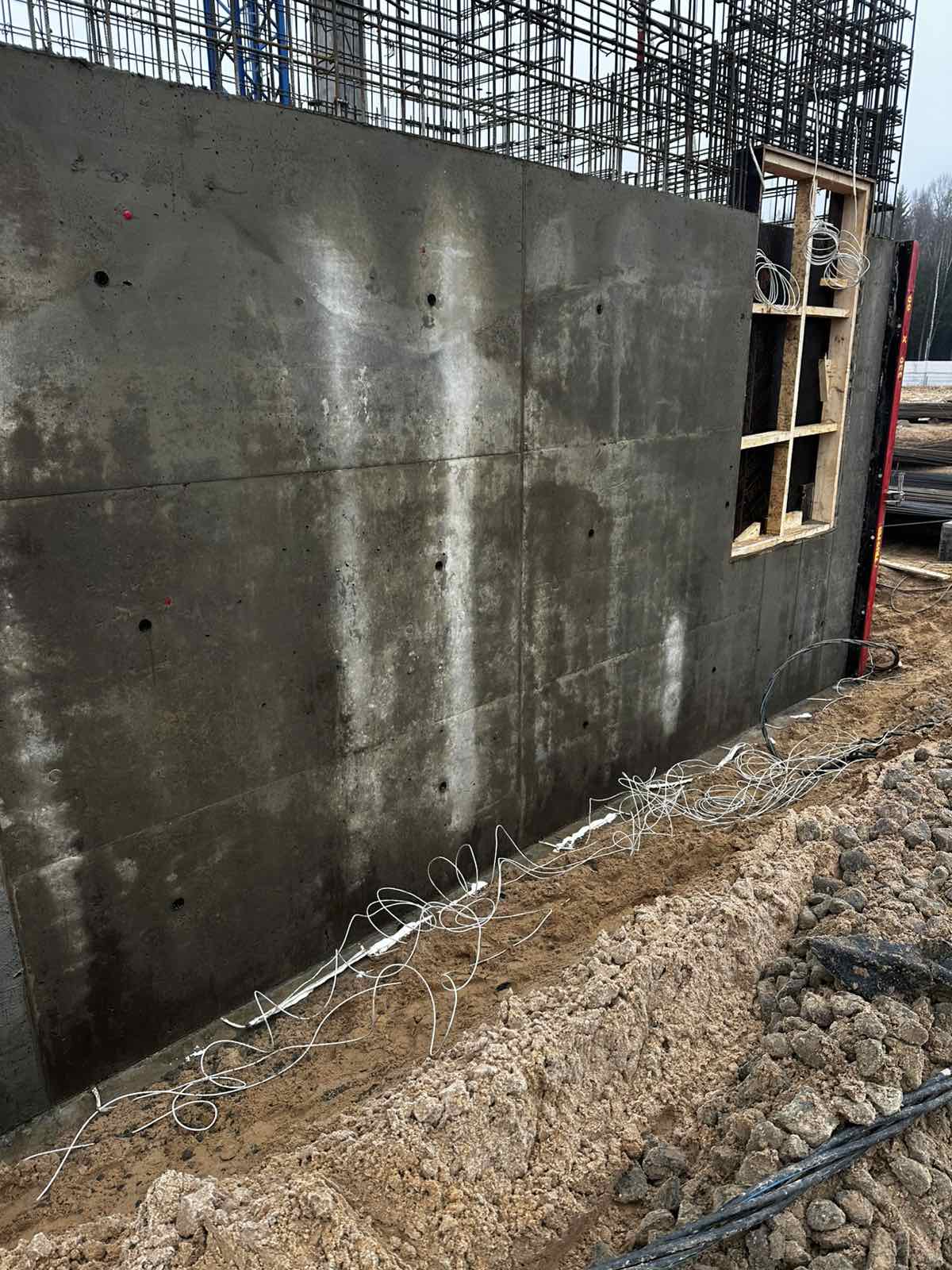 - Арматурные каркасы монтируются внутри опалубки, обеспечивая дополнительную прочность стенам.